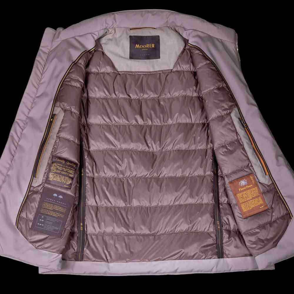 El interior incorpora un acolchado ligero de plumón de oca con pespunteado tipo boudin, proporcionando aislamiento térmico sin añadir volumen excesivo. Su cierre frontal de cremallera bidireccional permite una mayor libertad de movimiento, mientras que los bolsillos laterales con cremallera y los compartimentos interiores para documentos aportan funcionalidad en el día a día.