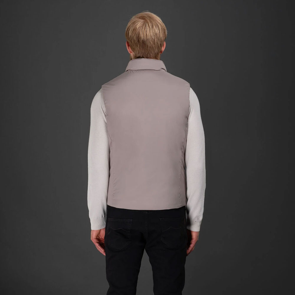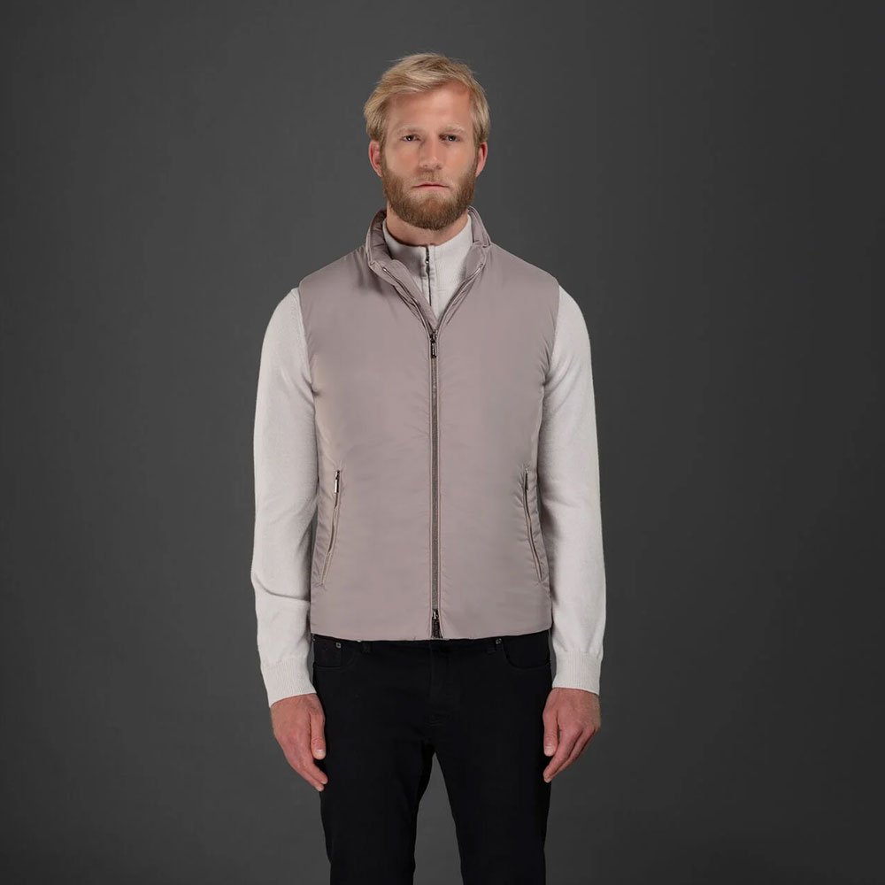 Los detalles interiores con ribetes de la marca y acabados en mezcla de franela refuerzan el carácter premium de la prenda. Fabricado en Italia, este chaleco es perfecto para looks urbanos elegantes o como capa intermedia en temporadas de entretiempo.