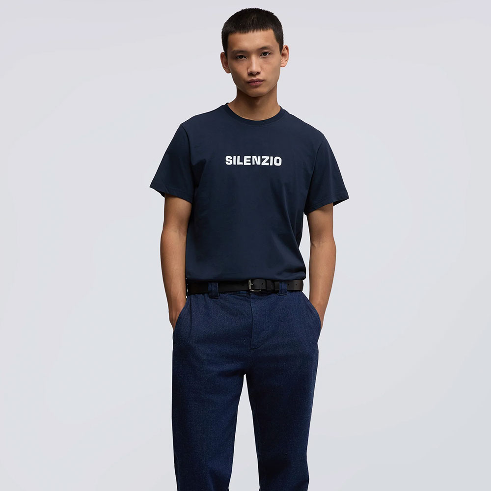El estampado Silenzio en la parte frontal aporta personalidad sin romper la estética minimalista de la prenda. Su diseño de cuello redondo y su corte regular hacen que esta camiseta sea muy fácil de combinar con vaqueros, pantalones chinos o bermudas, tanto en looks casuales como en estilismos urbanos más cuidados.