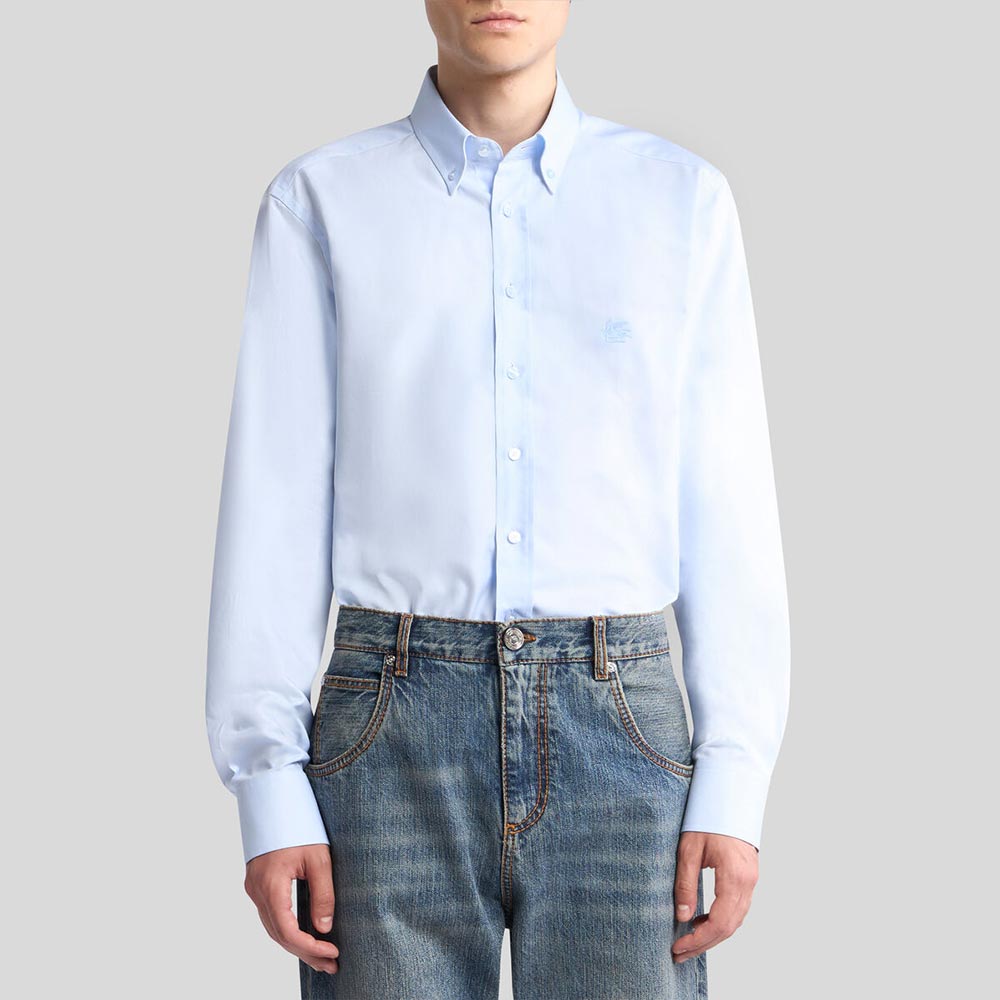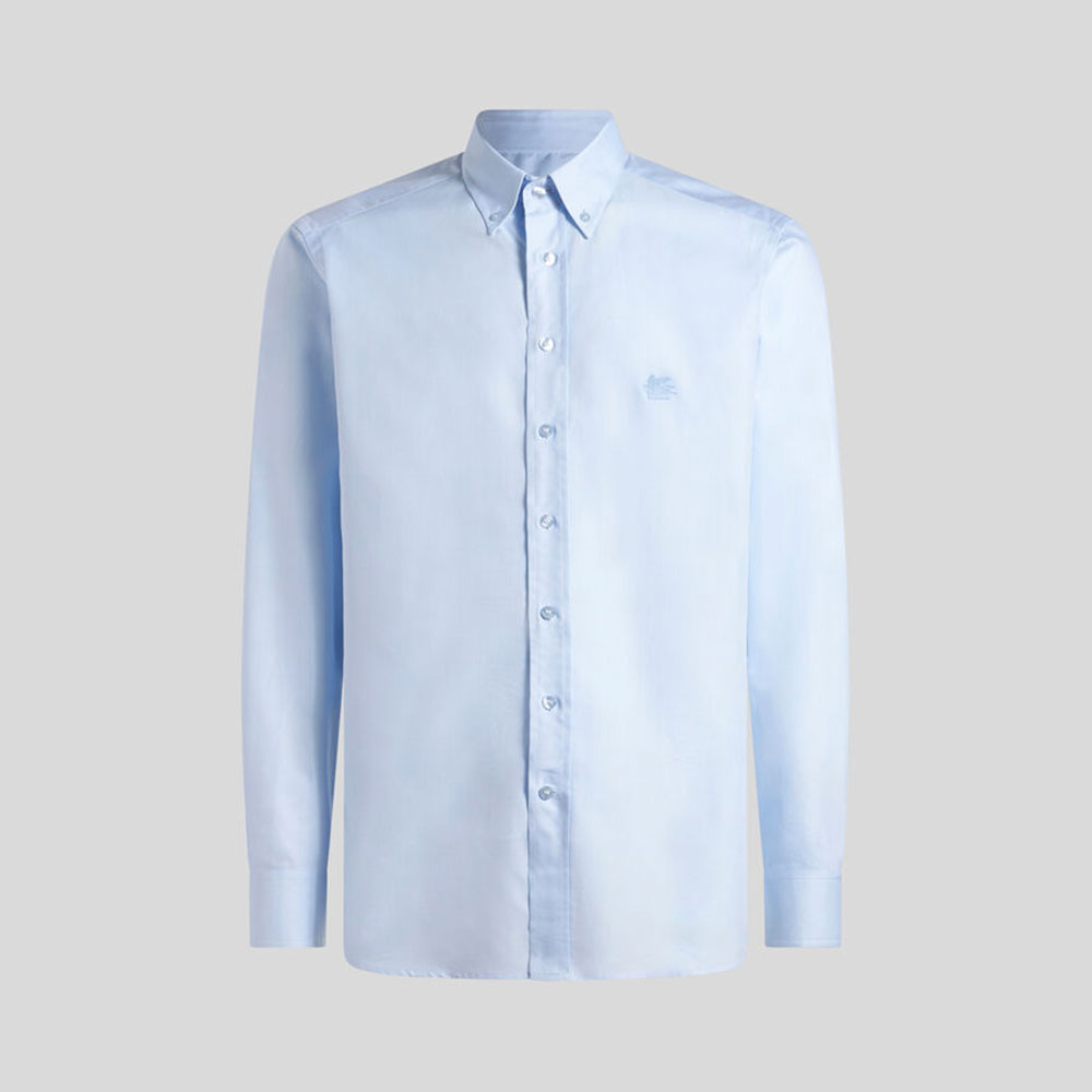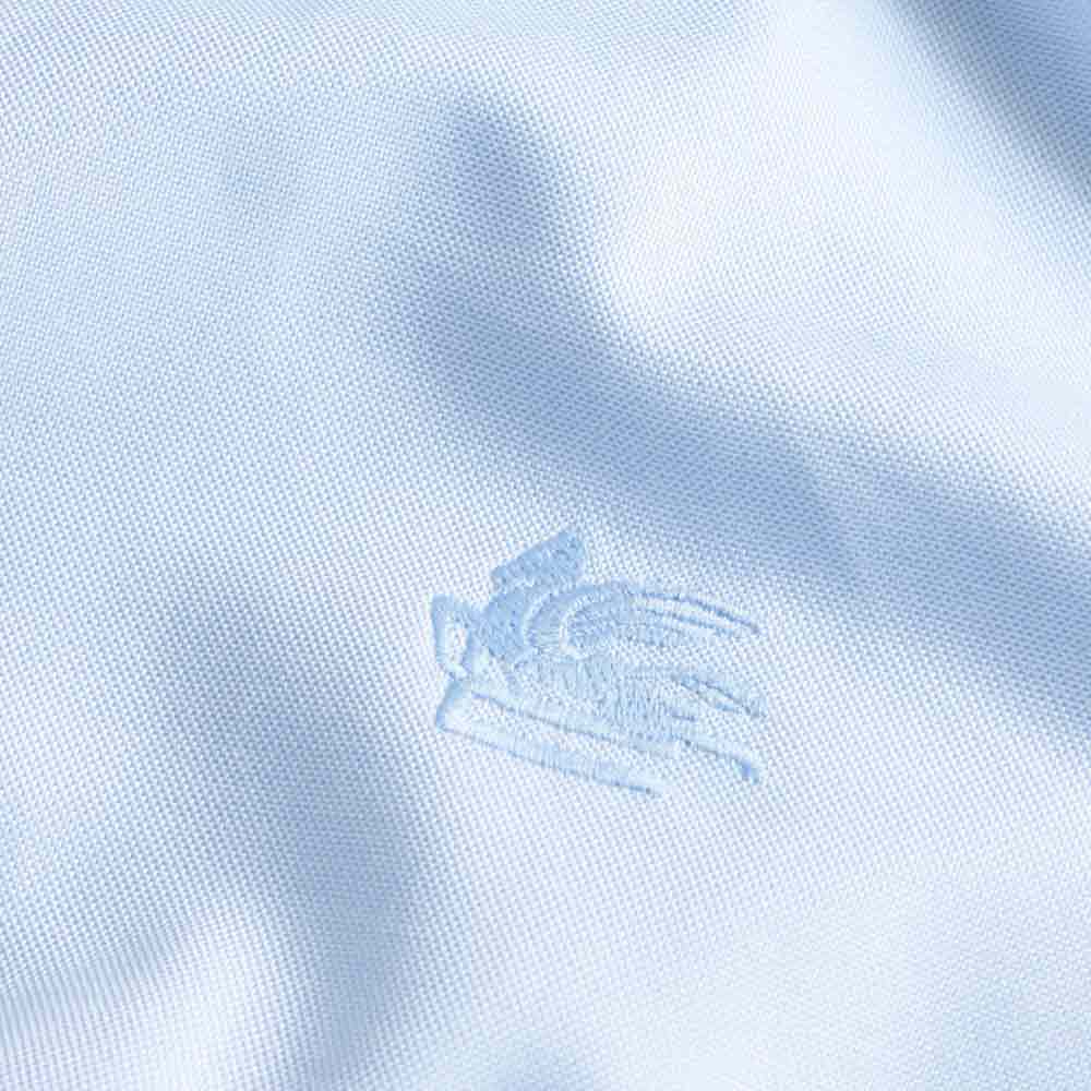 La camisa azul claro con cuello abotonado y logo de Etro está disponible en el catálogo de Miralles 1986.