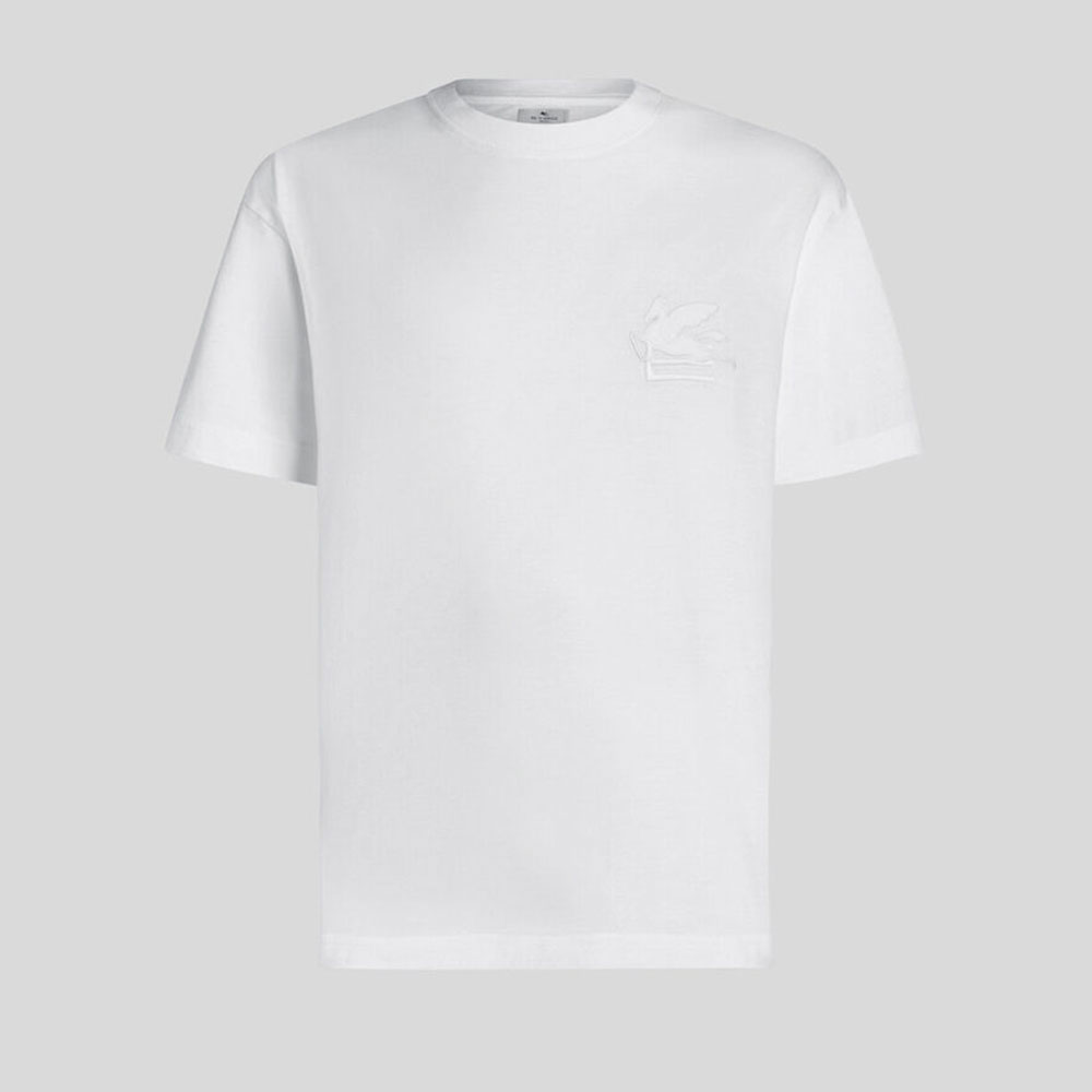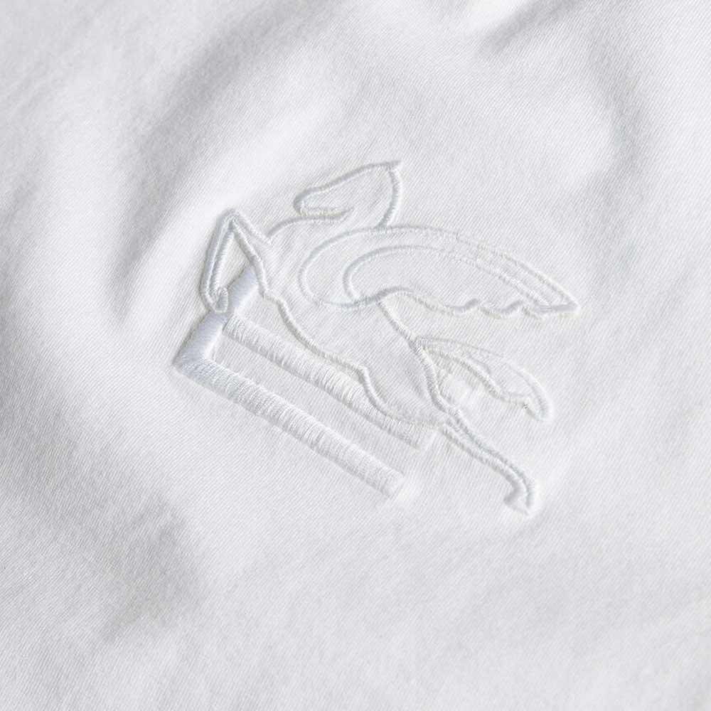 La camiseta blanca con bordado Pegaso de Etro eleva un básico del armario masculino con su característico estilo. Confeccionada en 100% algodón de alta calidad, esta prenda ofrece una textura suave y cómoda para el uso diario.