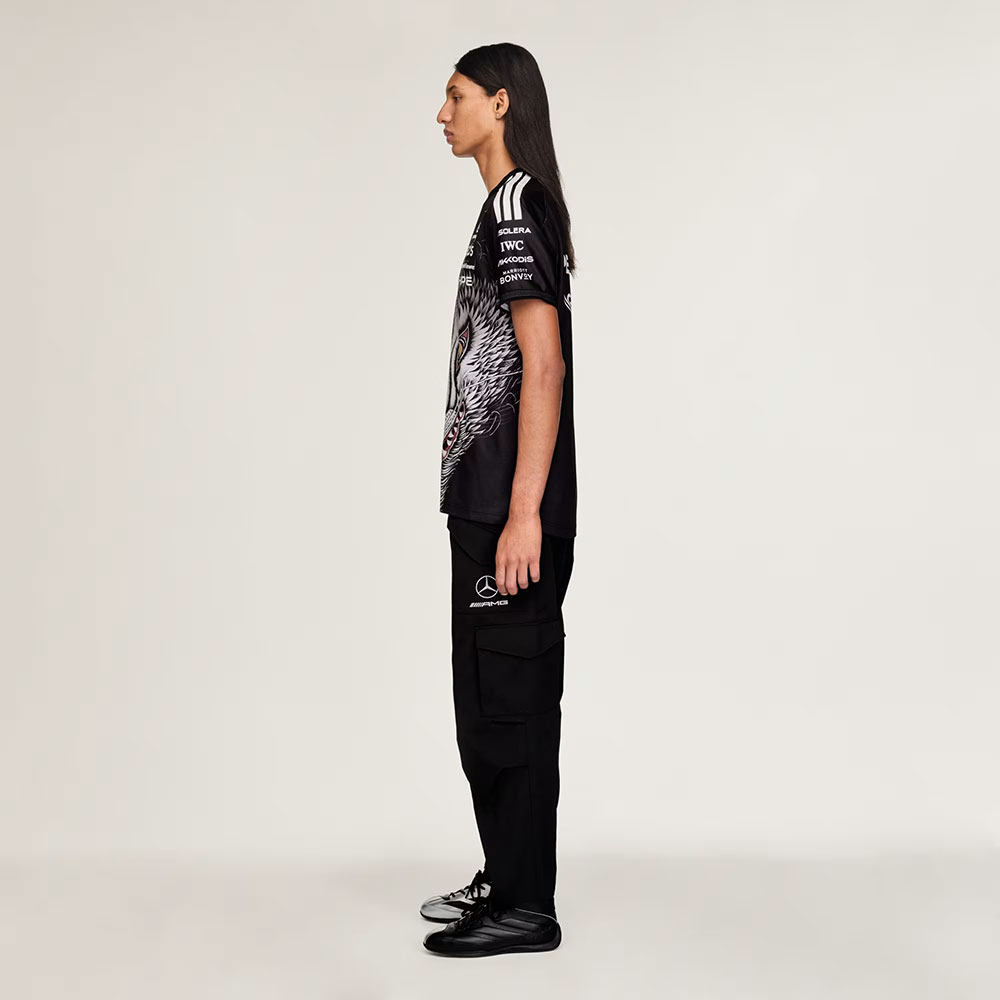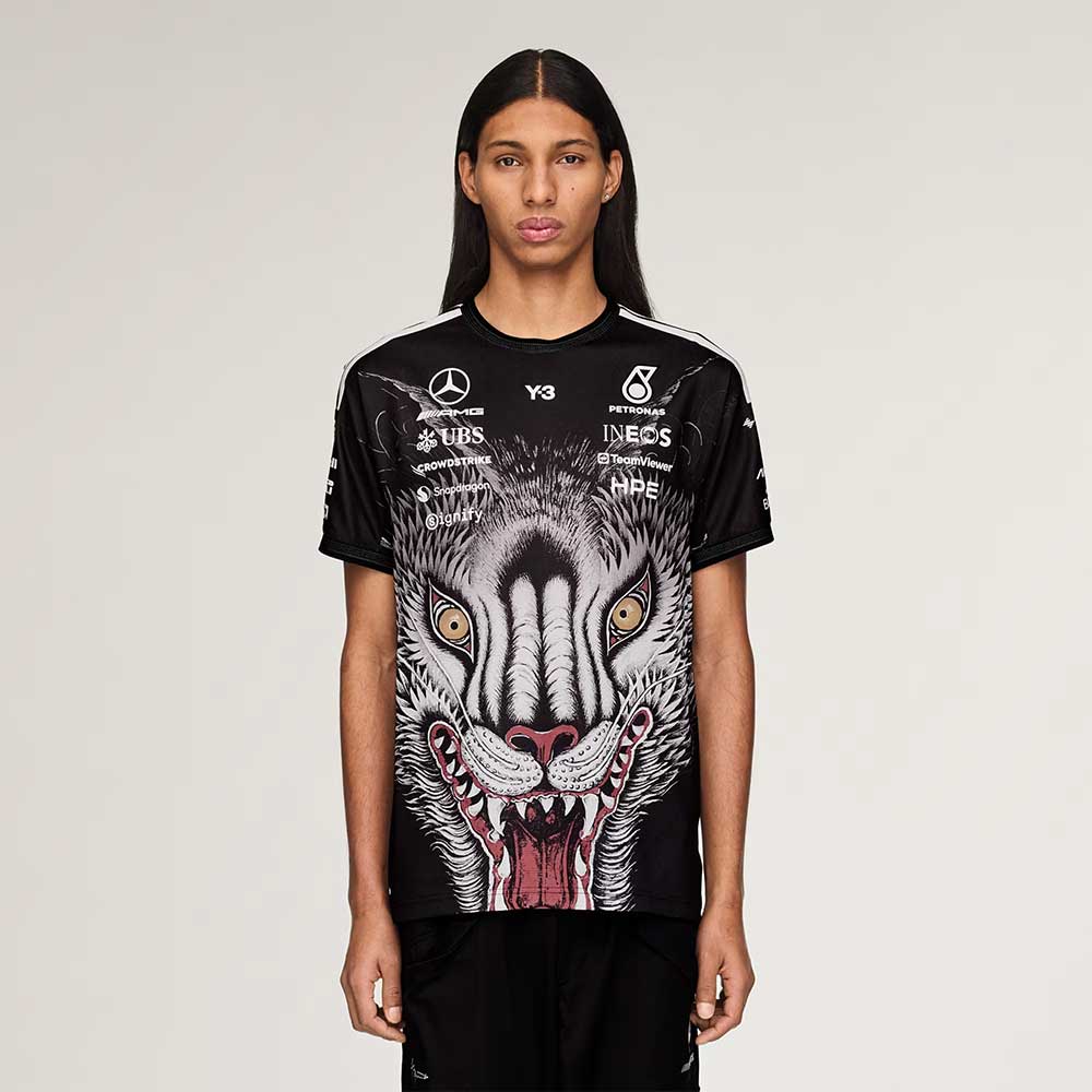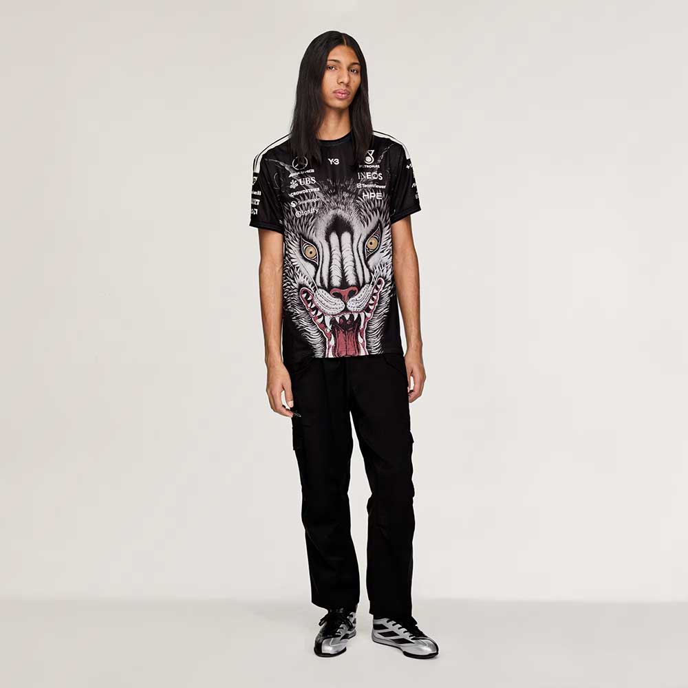 El diseño destaca por su estampado integral con la cabeza de lobo, inspirado en el archivo histórico de Y-3, aportando un fuerte impacto visual y una identidad gráfica inconfundible. La disposición estratégica de los logotipos de Y-3 y de los patrocinadores refuerza su estética vinculada al motorsport.