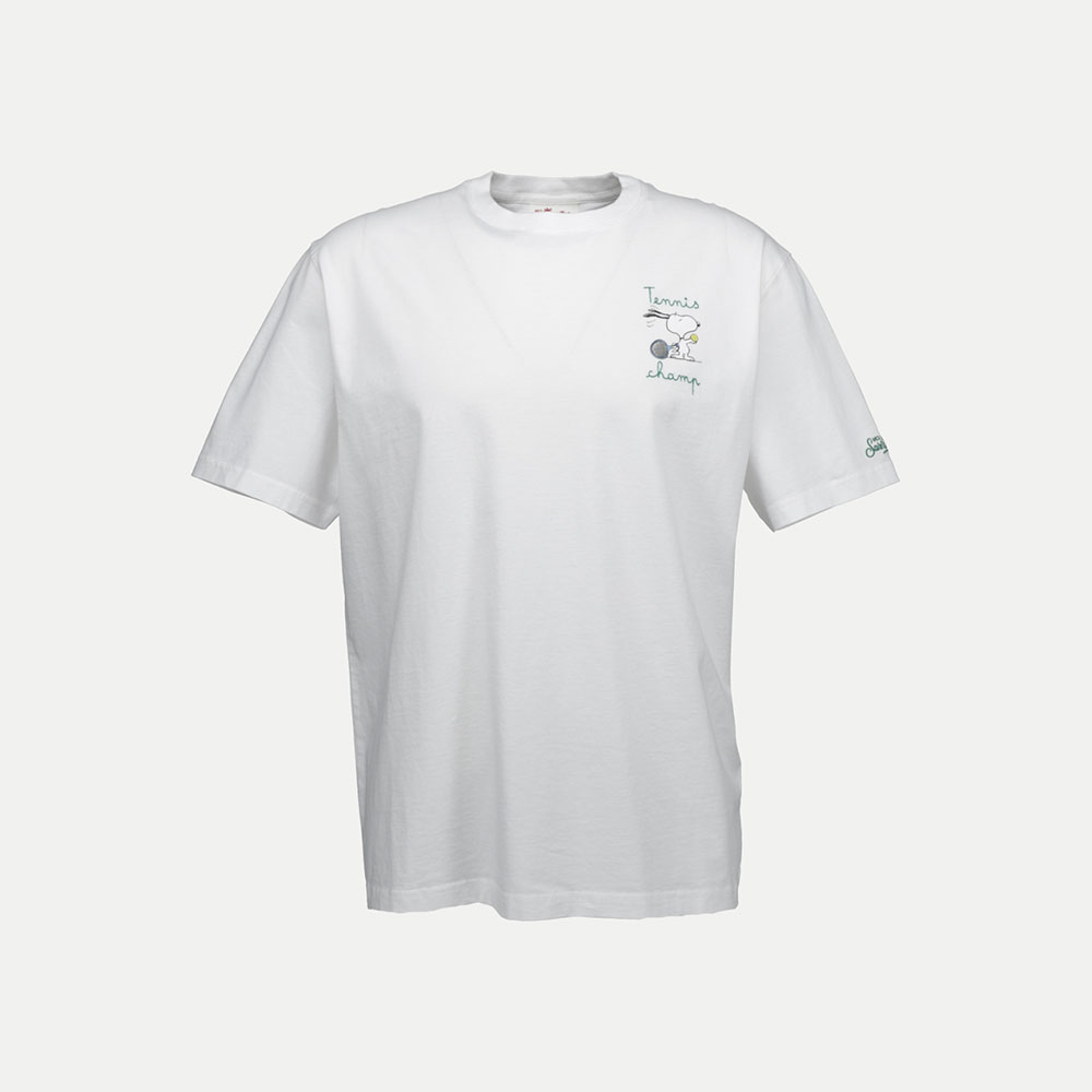 El diseño presenta un estampado de Snoopy como campeón de tenis en el pecho, aportando un toque de humor y sofisticación. El cuello redondo y las mangas cortas refuerzan su estilo casual, mientras que el bordado del logotipo de MC2 Saint Barth en la manga izquierda añade un detalle distintivo.