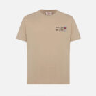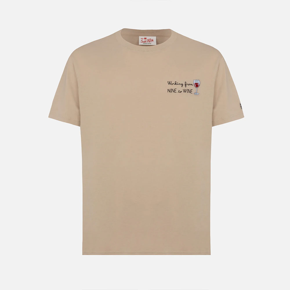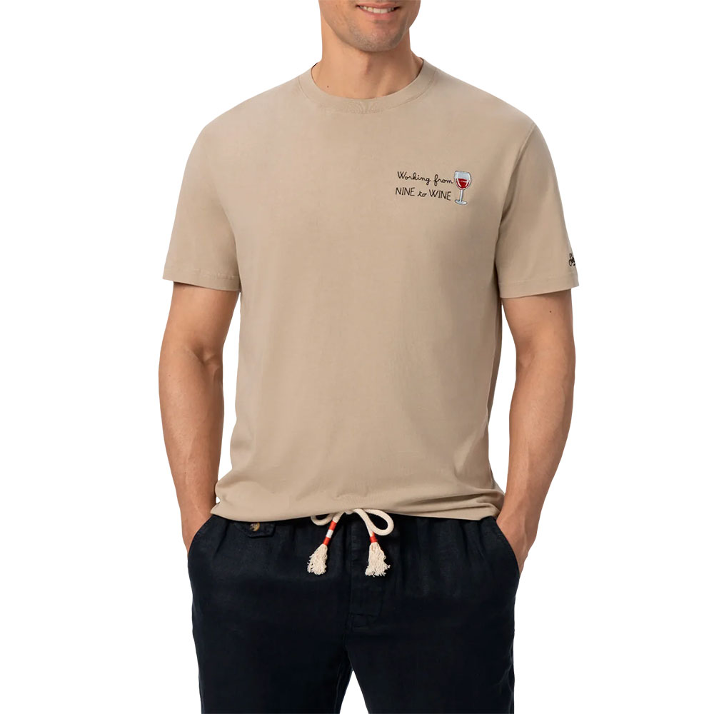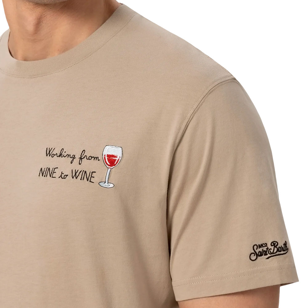 El diseño presenta un bordado en el pecho con la frase «Nine to Wine», aportando un toque de humor y sofisticación. El cuello redondo y las mangas cortas refuerzan su estilo casual, mientras que el bordado del logotipo de MC2 Saint Barth en la manga izquierda añade un detalle distintivo.