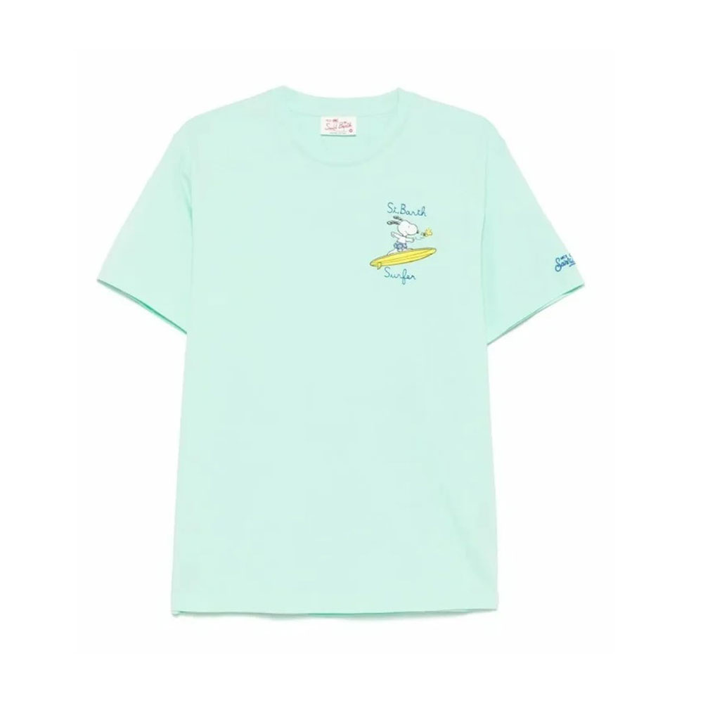 La camiseta Snoopy Waves 55 Emb. de MC2 Saint Barth es una oda al espíritu veraniego y relajado. Confeccionada en suave algodón 100%, esta camiseta blanca de corte regular presenta en el pecho un bordado colorido de Snoopy sobre una ola, transmitiendo ese aire libre y divertido que caracteriza a la marca.