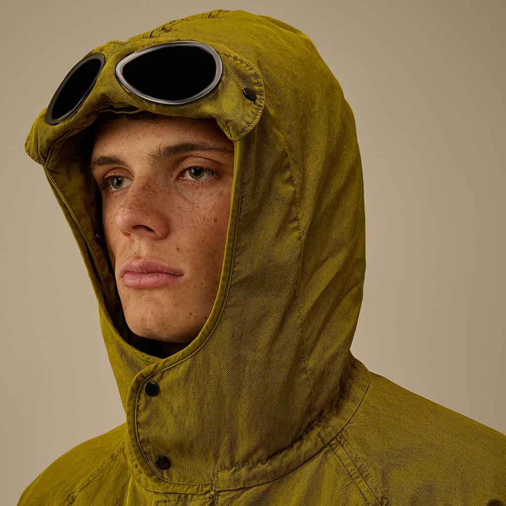La chaqueta Panama-R Mixed Goggle Jacket 246 de C.P. Company, es una prenda técnica de alto rendimiento que combina innovación textil y estética funcional. Está confeccionada en Panama-R, un tejido Oxford desarrollado con hilos de nylon reciclado que ofrece resistencia, ligereza y carácter sostenible.