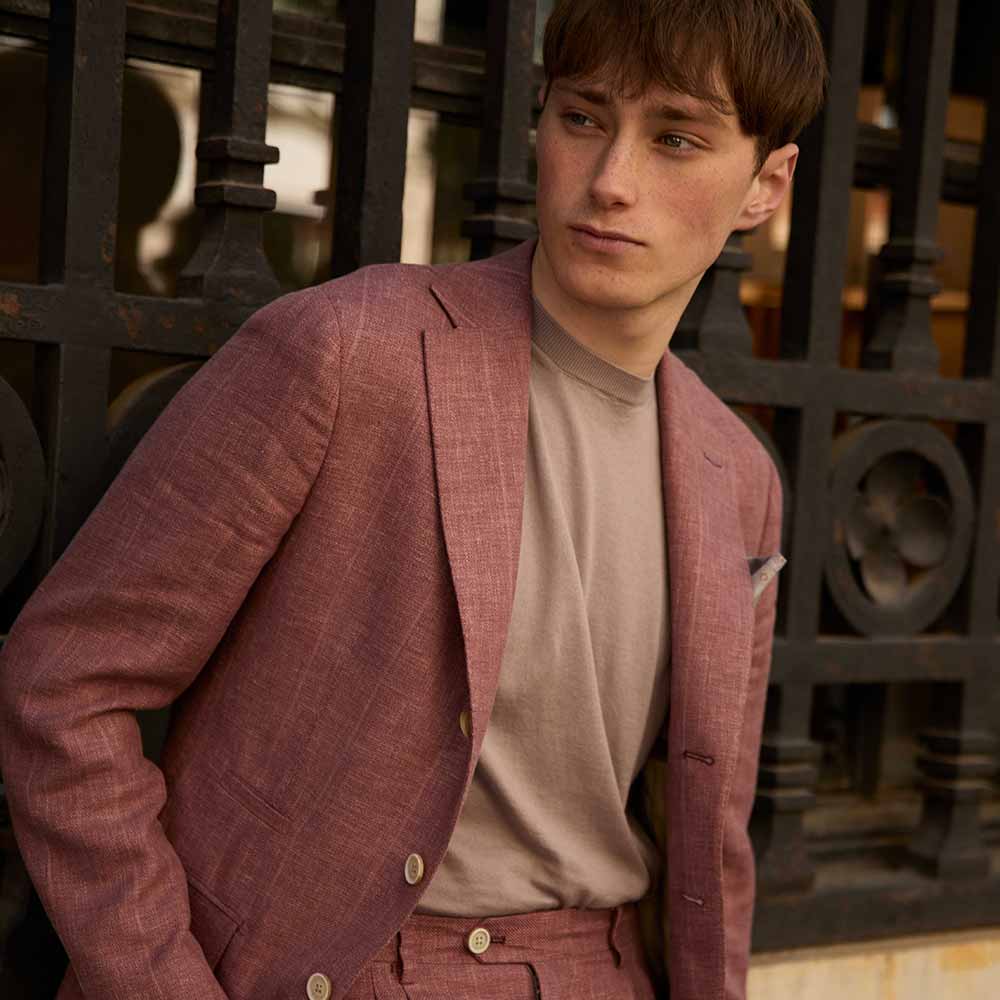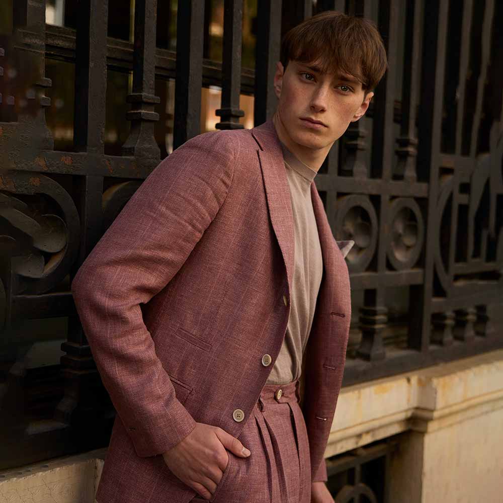 Traje slim fit de botonadura sencilla confeccionado en una exclusiva mezcla de lino, cachemira y seda, que combina ligereza, elegancia y sofisticación contemporánea.