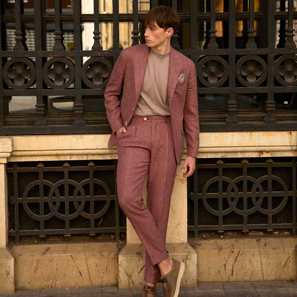 Su corte slim y su estructura ligera proporcionan una silueta moderna y refinada, mientras que el tono arcilla aporta un toque diferencial frente al clásico traje azul o negro.