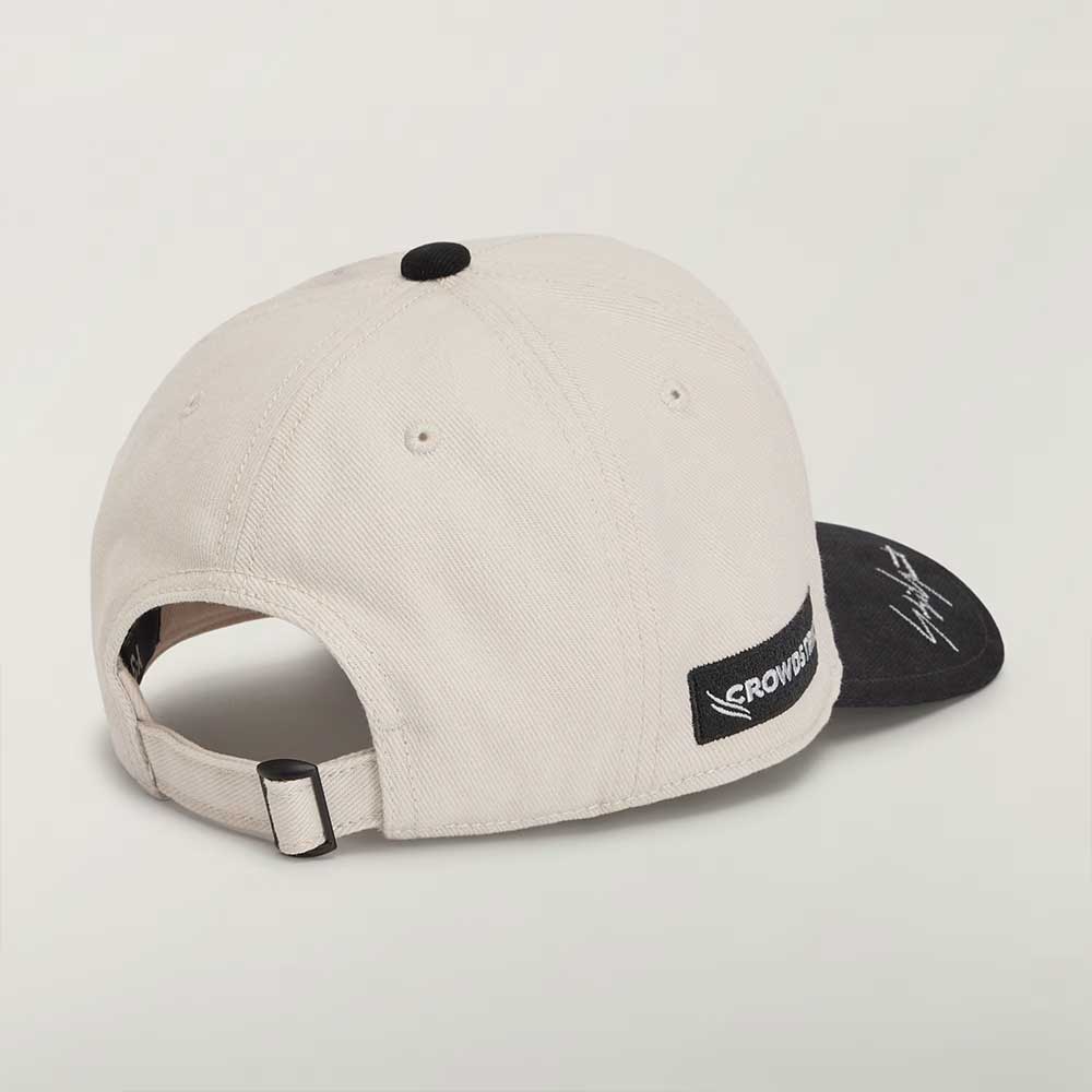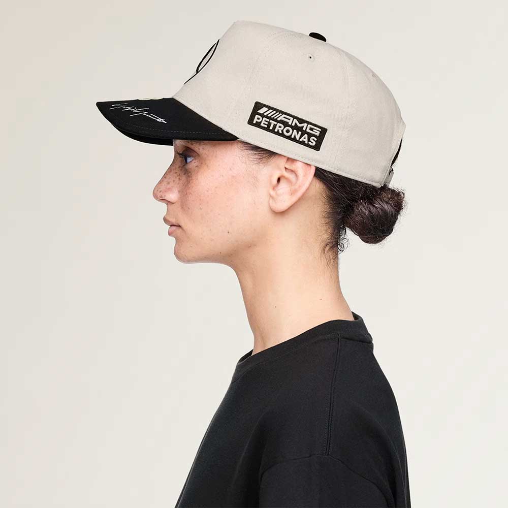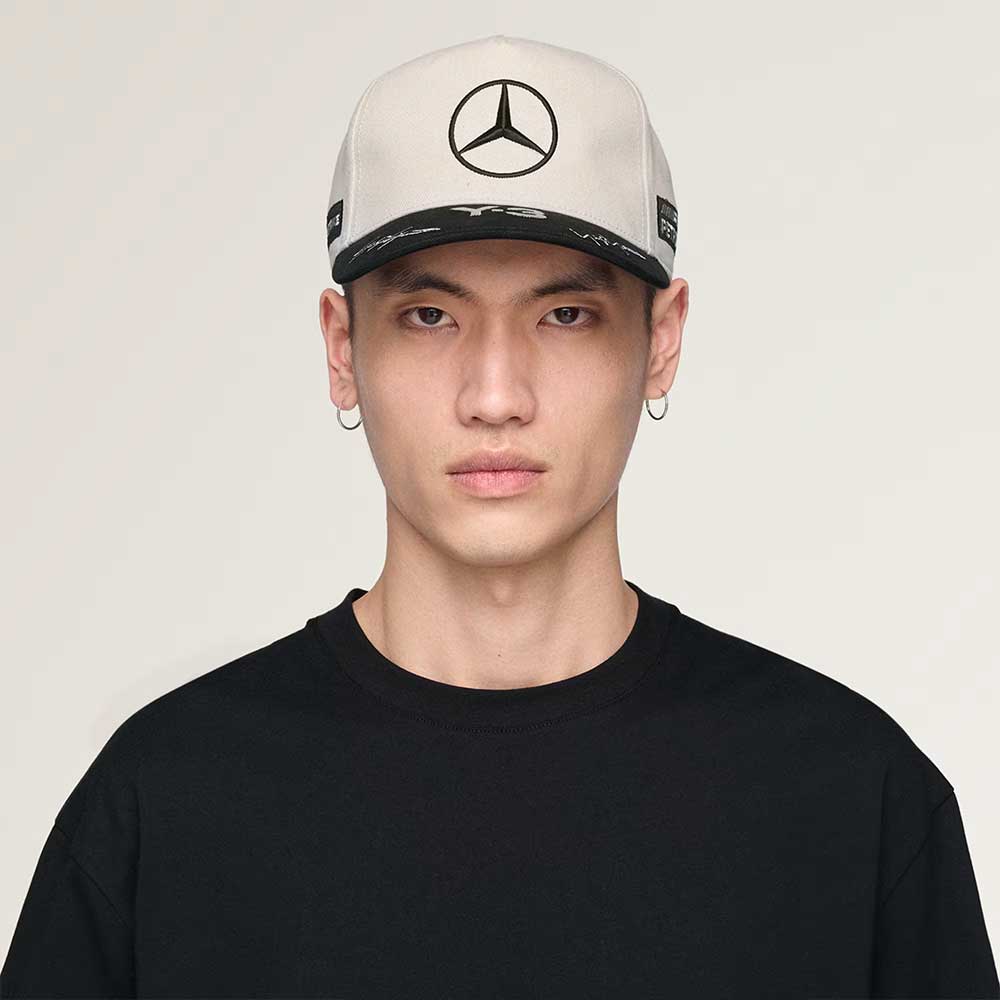 El frontal incorpora la estrella de Mercedes-Benz bordada, mientras que la visera presenta el logotipo Y-3 acompañado de la firma de Yohji Yamamoto, reforzando el carácter premium de la prenda. En los laterales, los bordados de AMG Petronas y CrowdStrike aportan autenticidad y conexión directa con el equipo.