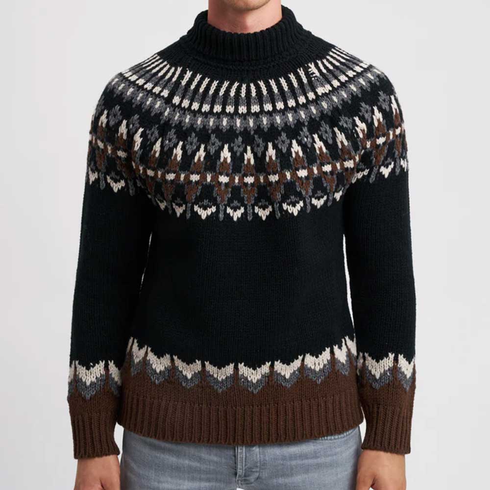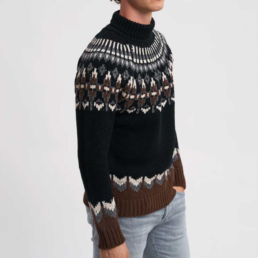 El jersey de cuello alto Dolcevita M00983U 999 de Dondup está confeccionado en una mezcla equilibrada de lana y poliéster, combina calidez y resistencia. Su diseño presenta un elaborado patrón geométrico jacquard en color negro, que aporta sofisticación y estilo contemporáneo. El cuello alto y los puños y bajo de canalé garantizan un ajuste cómodo y refinado. Ideal para looks elegantes y urbanos: combínalo con blazer y pantalón para un toque formal, o úsalo solo con denim para un outfit casual de invierno. Fabricado en Italia, refleja la calidad premium y la atención al detalle que caracteriza a Dondup.