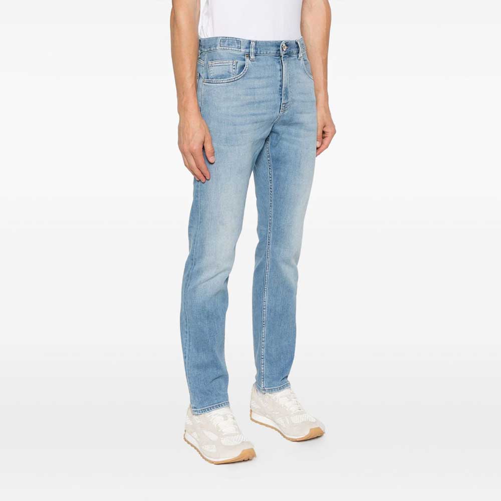 El corte slim-fit aporta una silueta contemporánea sin perder elegancia, mientras que el lavado azul “08” aporta carácter y versatilidad. El diseño clásico de cinco bolsillos se actualiza con detalles refinados: costuras reforzadas, trabillas de estilo sastrería y cierre de botón y cremallera.