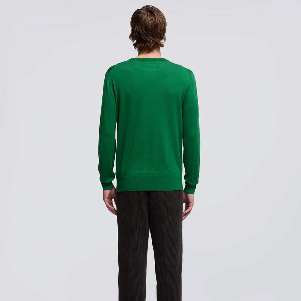 El suéter en cuello redondo de Lana Merino Mod. M195 verde de Aspesi es una prenda de punto elegante y funcional hecha íntegramente con lana virgen de alta calidad. Su tejido de punto liso en calibre 16 ofrece una textura suave al tacto y una caída impecable. El diseño incluye un cuello redondo clásico, mangas largas y terminaciones acanaladas tanto en los puños como en el bajo, que aportan estructura y ajuste. Con un corte regular, este jersey combina perfectamente con estilos casuales o más formales, y se convierte en una pieza esencial para quienes valoran el confort, la versatilidad y el diseño discreto pero sofisticado.