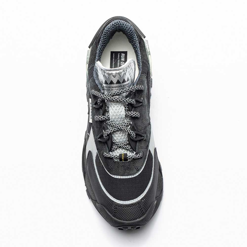 Zapatillas Run Of K2 Man en negro: ante, ripstop y detalles reflectantes. Diseño urbano técnico con suela dentada y estilo italiano.